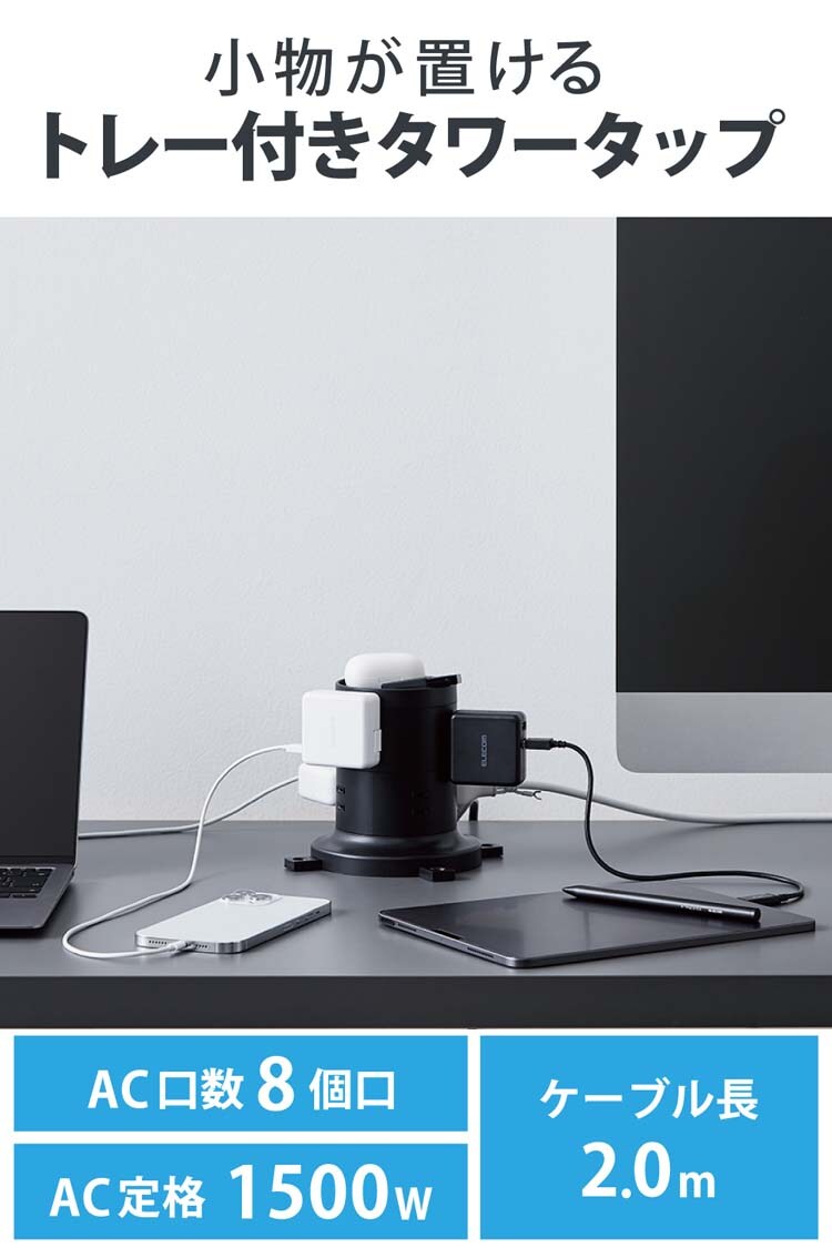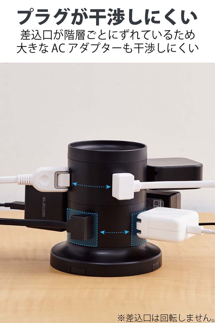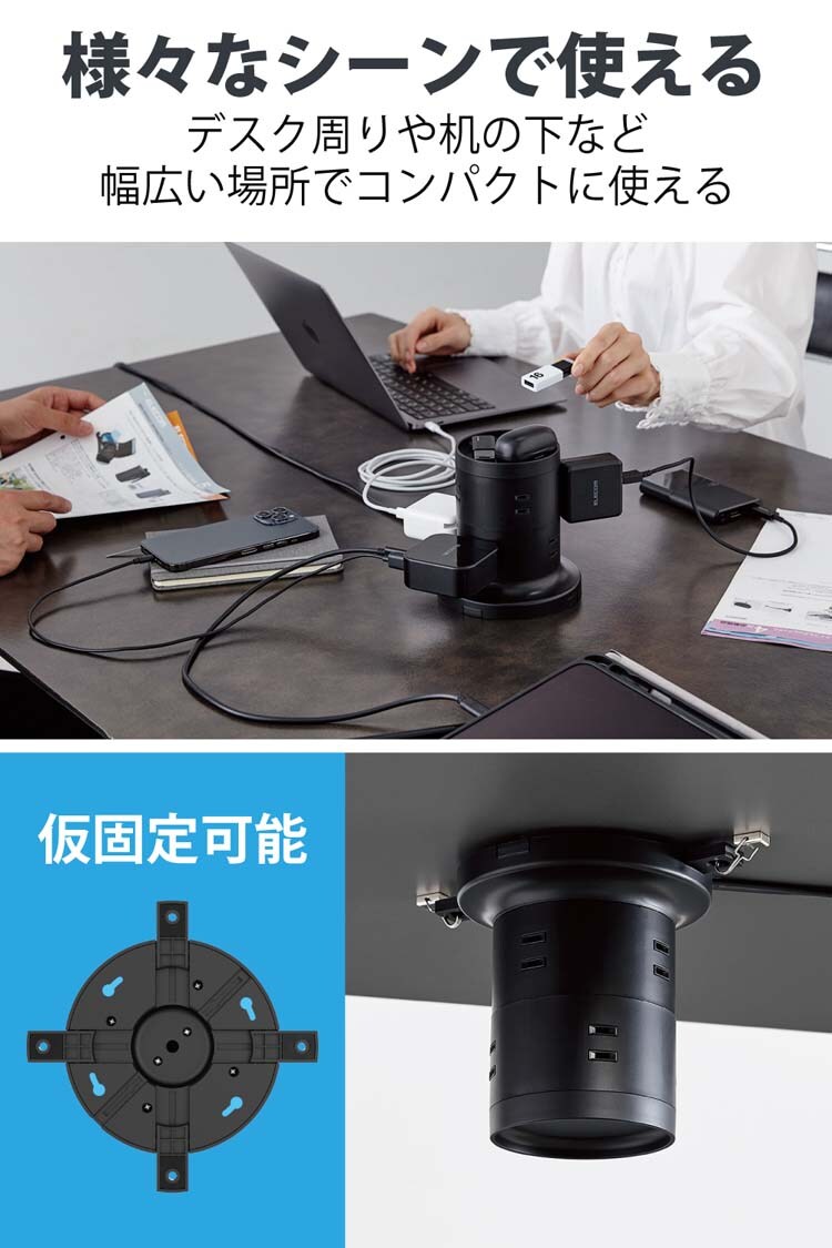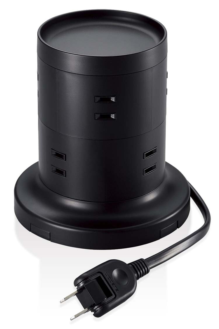 ●タワー型のため、差込口が多くても小さな面積で設置でき、360度あらゆる方向から接続できるので、会議室のデスクなどでの使用に便利です。