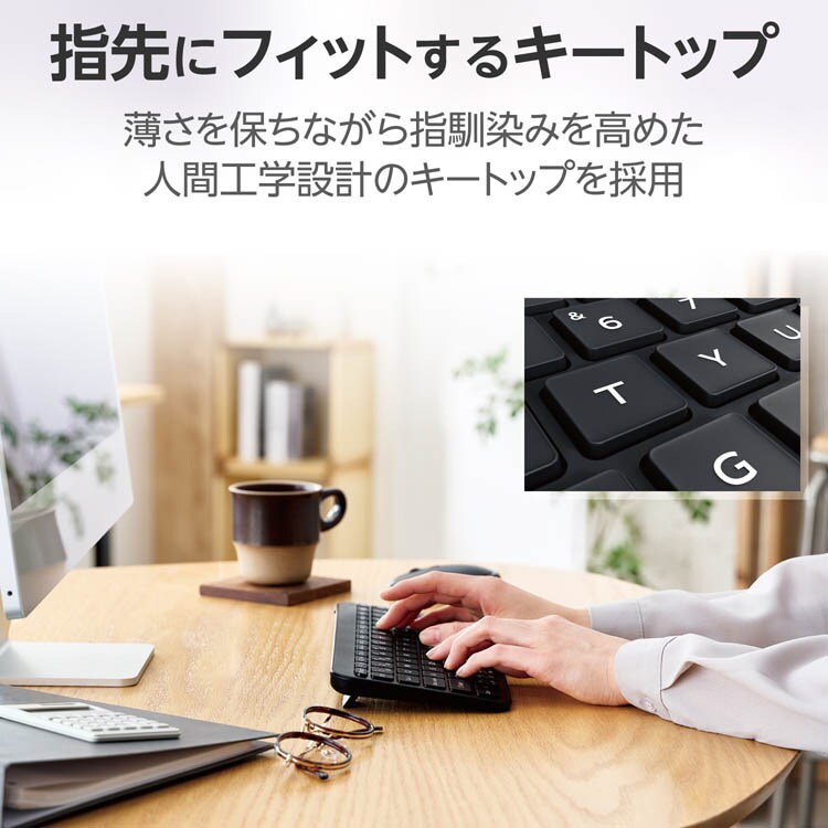 ●薄さを保ちながら指馴染みを高めた、こだわりのキートップ形状と、安定感抜群の大型の角度調整スタンドにより、いつでもどこでも心地よいタイピングが可能です。