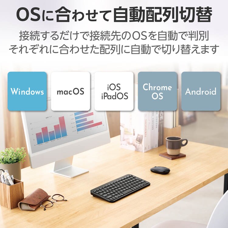 ●ファームウェアを搭載することにより、Windows、macOS、ChromeOS、iOS/iPadOS、Androidを自動で識別し、各OSに最適な入力モードに切り替えます。