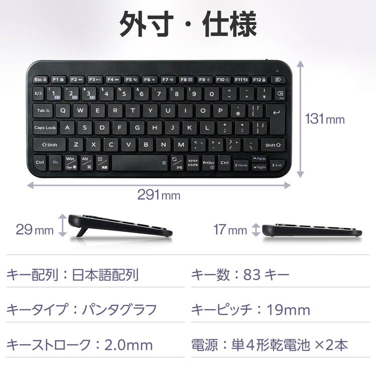 内容物:キーボード本体×1台、動作確認用単4形アルカリ乾電池×2本