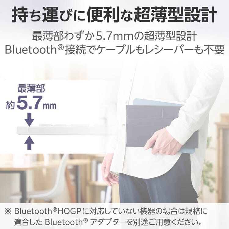 ●最薄部わずか5.7mmの超薄型の本体設計により、スマートにキーボードを持ち運ぶことができます。