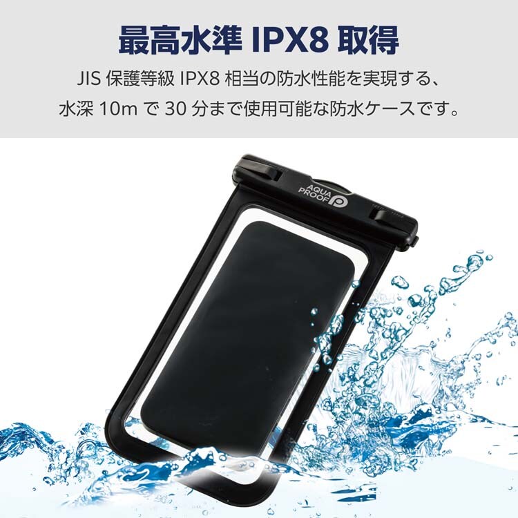 ●JIS保護等級 IPX8相当の防水性能を実現する、水深10mで30分まで使用可能なスマートフォン用防水ケース「AQUA PROOF」です。