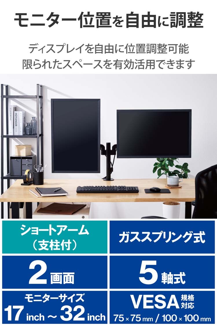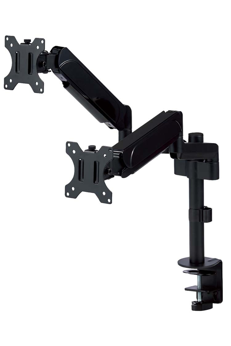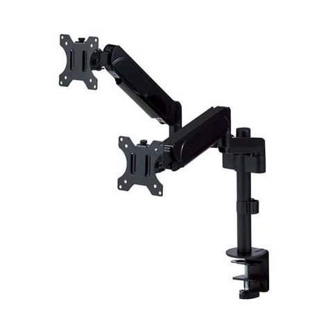 ●17~32インチサイズのモニターに対応するガススプリング式のデュアルモニターアーム、支柱付きです。