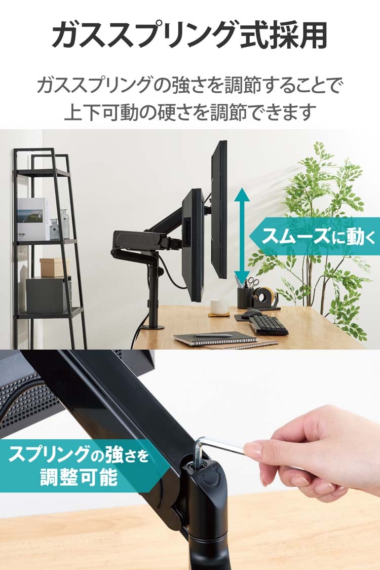 ●モニター取り付け後の可動がスムーズなのが特徴の製品です。ガススプリングの強さを調節することで、上下可動の硬さを調節することができます。