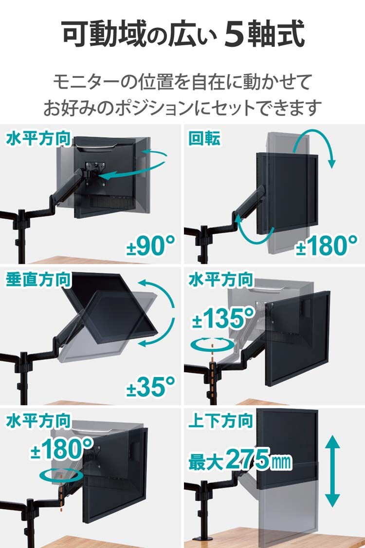| 対応サイズ:17~32インチ 耐荷重:約1~9kg(各アーム) 寸法:幅約940mm*奥行約123mm*高さ約715mm 質量:約4.76kg 色:ブラック 取り付け画面数:2画面 材質:スチール、アルミ合金、ABS 可動方式:ガススプリング式 対応規格:VESA規格(75mm*75mm、100mm*100mm) 可動範囲 ・パン:左90度/右90度 ・ローテーション:360度 ・チルト:上35度/下35度 取り付け可能天板厚 ・クランプ(挟んで固定):10~85mm ・グロメット(穴に通して固定):10~40mm 固定方式:クランプ式/グロメット式 軸数:5軸 ・グロメット式推奨穴サイズ:約直径10mm |