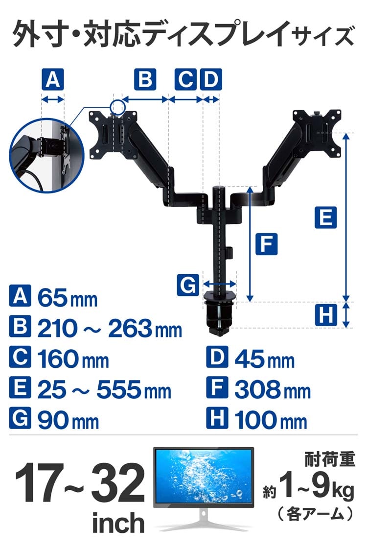 エレコム モニターアーム デュアル 17-32インチ グロメット クランプ VESA ブラック (1台)