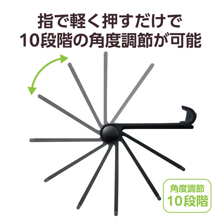 | ・材質:ABS、アルミ合金、TPR ・外形寸法:幅約100mm×奥行約20mm×高さ約85mm(折りたたみ時) ・重量:約155g ・カラー:ブラック ・対応機種:4.6~12.9インチのスマートフォン・タブレット ・耐荷重:2kg ・角度調節:○ |