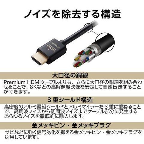 ●Premium HDMIケーブルよりも、さらに大口径の銅線を組み合わせることで、8Kなどの高解像度映像を安定して高速伝送することができます。