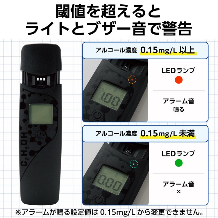 ●測定時、閾値を超えたアルコールを検出するとLEDライトが赤く光り、ブザー音で警告します。