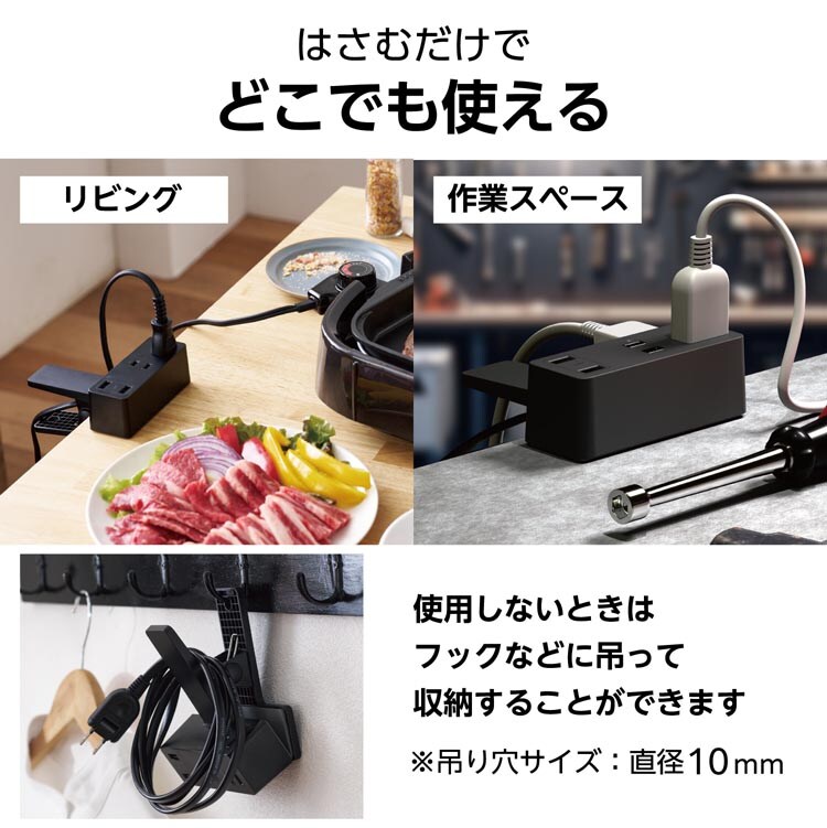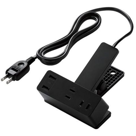 ●机などに挟んで使えるクリップ機構を搭載した、USB-Aポート付きの電源タップです。