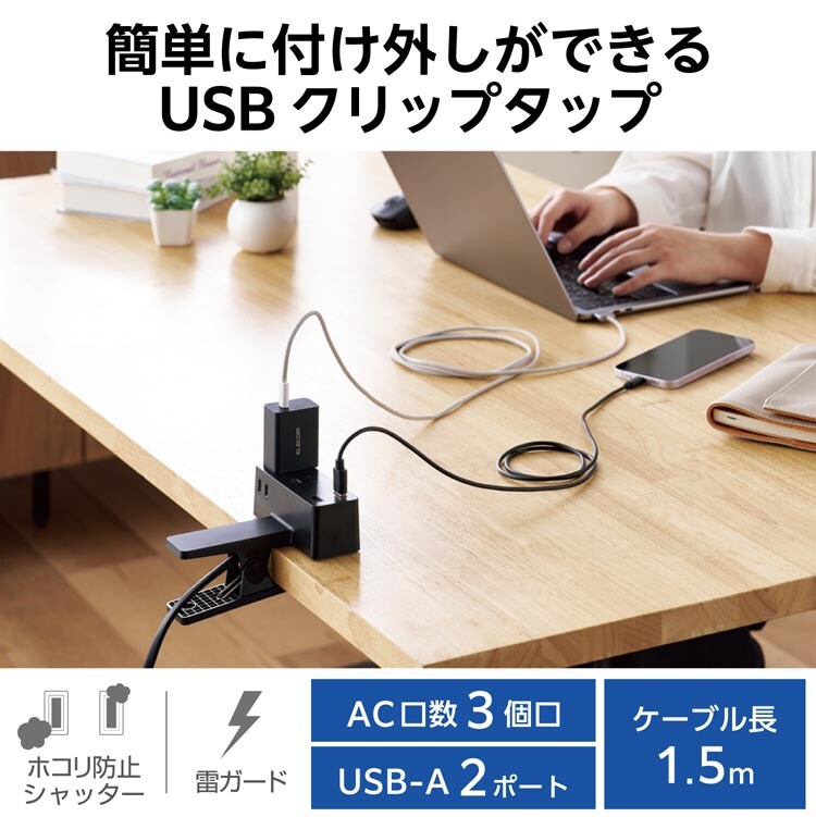 【エレコム USBポート付きクリップタップ 1.5m延長コード 雷ガード ブラックの商品詳細】