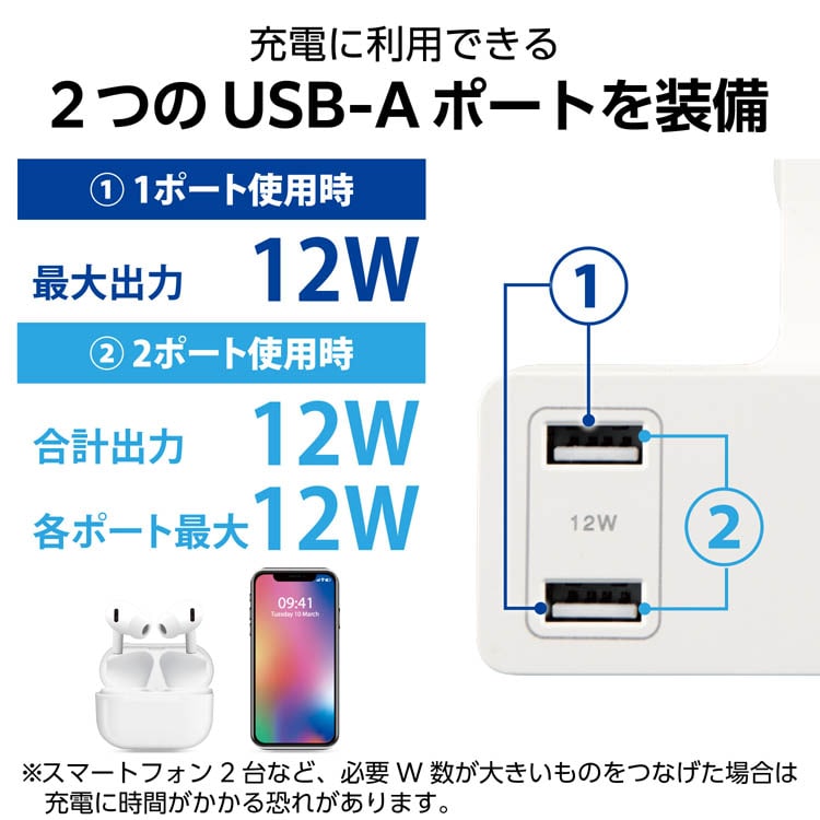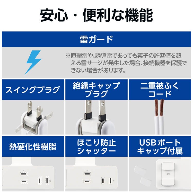 | ・差込口仕様:2ピン(極性のある2ピン式プラグも接続可能) ・差込口個数:3個口 ・プラグ仕様:2ピン ・ACコード長:2.5m ・USB端子形状:USB-Aポート×2 ・AC側定格:14A、125V、合計1400Wまで ・USB側定格入力:AC100V-240V、50/60Hz、0.5A MAX ・USB側定格出力(1ポート使用時):12W(5V/2.4A) ・USB側定格出力(2ポート使用時):合計12W(5V2.4A)各ポート12W(5V/2.4A) ・極性対応:△(差込口は対応、プラグは目印のみ) ・スイッチ:× ・雷ガード:○ ・ほこりシャッター:○(AC差込口のみ) ・抜け止め機能:× ・差込口キャップ:○(USBポートのみ) ・通電表示ランプ:× ・二重構造:○ ・二重被ふく:○ ・絶縁キャッププラグ:○ ・スイングプラグ:○ ・固定方法:クリップ機構による机などへの仮固定が可能 ・マグネット:× ・吊り穴:○(φ10mm) ・ブレーカー:× ・ノイズフィルター:× ・モジュラージャック:× ・連動機能:× ・変換アダプタ:× ・カラー:ホワイト ・材質:ポリカーボネート樹脂、PVC樹脂、ユリア樹脂、黄銅、銅 ・外形寸法:幅約114mm×奥行約149mm×高さ約70mm※コード部分およびプラグ部分を除く ・質量:約398g ・付属品:取扱説明書 ・環境配慮事項:THINK ECOLOGY対応製品 ・使用可能地域:日本国内専用 ・法規:PSE(特定電気用品) ・保証期間:1年間 |