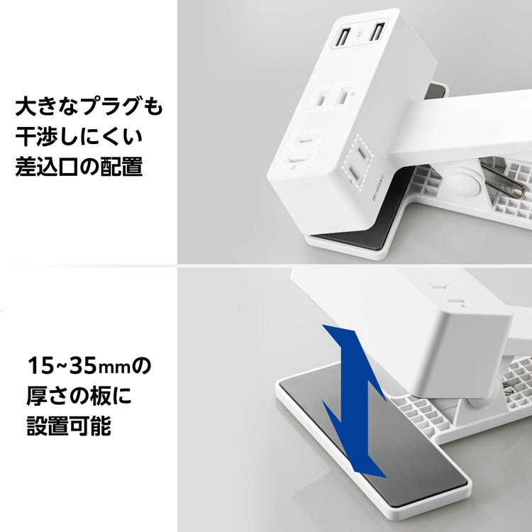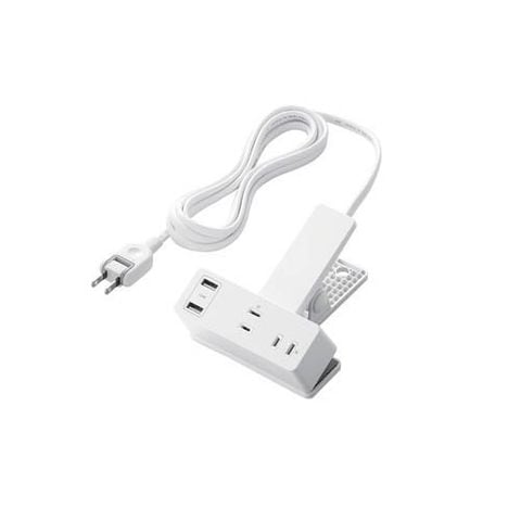 ●机などに挟んで使えるクリップ機構を搭載した、USB-Aポート付きの電源タップです。