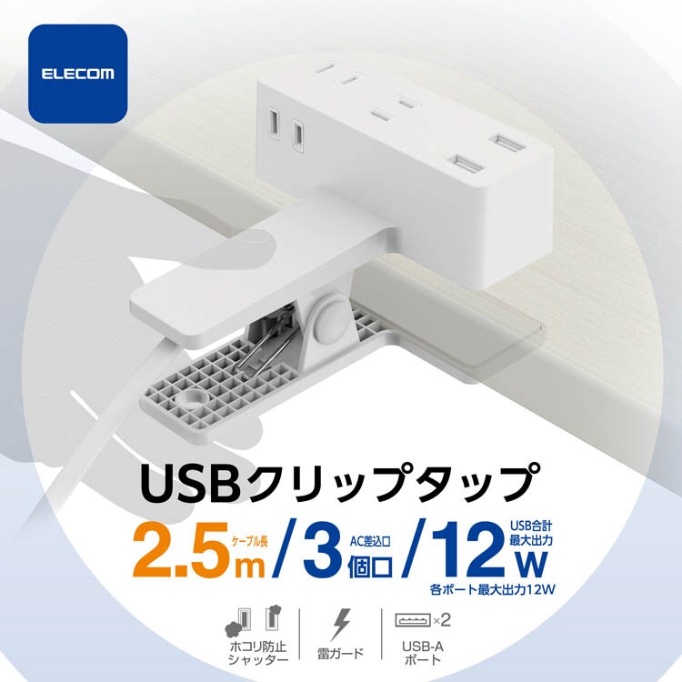 エレコム 電源タップ 延長コード USB付き 2.5m クリップ式 雷ガード ホワイト (1個)