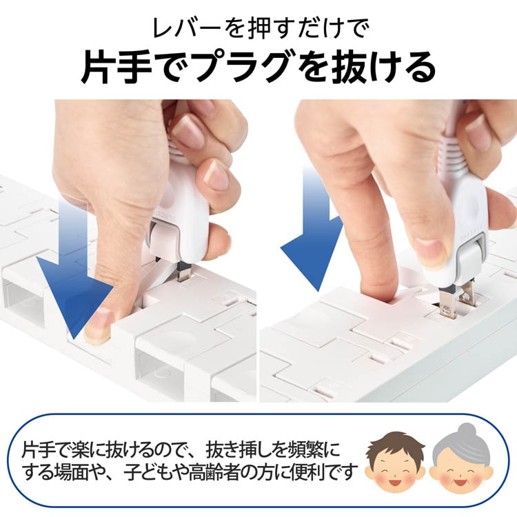 ●レバーを押すだけで簡単に、片手でプラグを抜ける6個口のタップです。タップを手で押さえたりプラグを強い力で引き抜いたりする必要はありません。