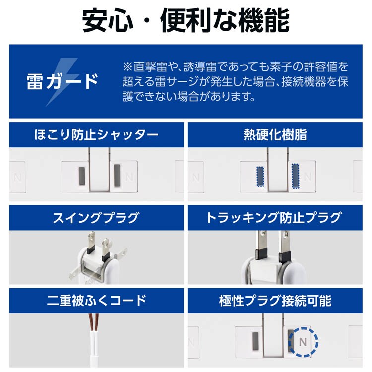 | ・差込口仕様:2ピン ・差込口個数:6個口 ・差込口間隔:40mm(差込口中心間寸法) ・プラグ仕様:2ピン ・ACコード長:約3m ・定格:15A、125V、合計1500Wまで ・極性対応:◯ ・スイッチ:× ・雷ガード:◯ ・ほこりシャッター:◯ ・抜け止め機能:× ・差込口キャップ:× ・通電表示ランプ:× ・二重構造:◯ ・二重被ふく:◯ ・絶縁キャッププラグ:◯ ・スイングプラグ:◯ ・マグネット:× ・吊り穴:◯ ・ブレーカー:× ・ノイズフィルター:× ・モジュラージャック:× ・連動機能:× ・変換アダプタ:× ・カラー:ホワイト ・材質:本体:ポリカーボネート樹脂・ABS樹脂、プラグ:PVC、差込口:ユリア樹脂 ・外形寸法:幅306mm×奥行61mm×高さ26mm※本体のみ(突起部を除く) ・質量:約331g ・付属品:取扱説明書 ・環境配慮事項:THINK ECOLOGY対応製品 ・使用可能地域:日本国内専用 ・法規:PSE(特定電気用品) ・保証期間:1年間 ・その他:イージーリリース機構、フックと吊り穴を兼ねた横転防止機構搭載 |