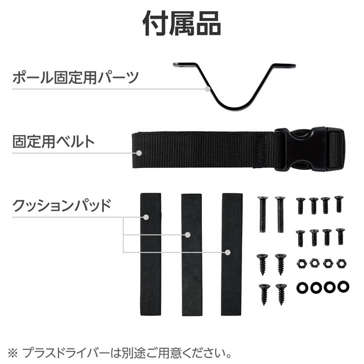 ●機器の固定をサポートする固定ベルトと、モニターアームのポール部分に取り付けるための固定用パーツを付属しています。