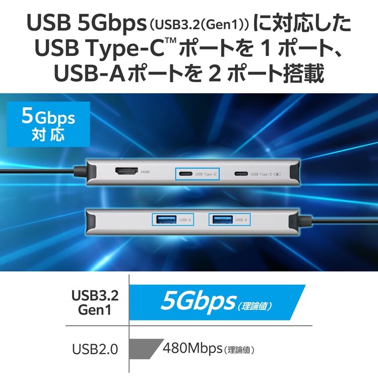 ●USB 5Gbps(USB3.2(Gen1))に対応したUSB Type-Cポートを1ポート、USB-Aポートを2ポート搭載しています。