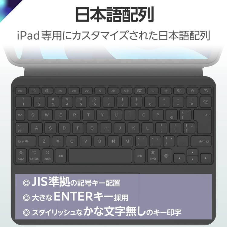 ●iPad Air専用にカスタマイズされた日本語配列を採用。大きなエンターキーやJISに準拠した記号キーの配置により、日頃お使いのキーボードから違和感なく移行できます。
