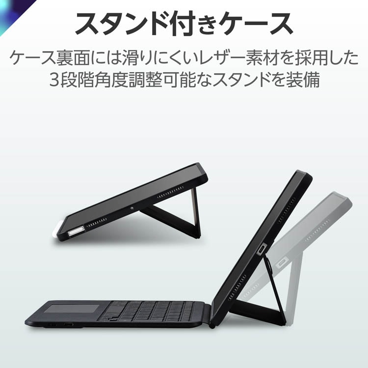 ●ケースの裏面にはスタンドを装備しています。好みや使用シーンに合わせて3段階の角度調整が可能です。スタンドにはラバー素材を使用し、タイピング時の安定性を高めます。