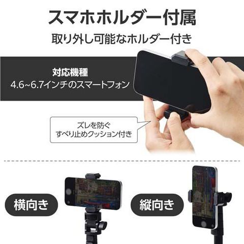 | ・材質:三脚:ABS・アルミニウム、スマホホルダー:ABS・EVA ・外形寸法:φ約35mm×H約420mm ※突起部除く ・最大地上高:約1410mm ・最低地上高:約430mm ・重量:三脚:約399g、スマホホルダー:約23g ・カラー:ブラック ・対応機種:4.0インチ~6.7インチ、1/4インチネジに対応した一眼レフカメラや拡張アクセサリー ・内容物: |