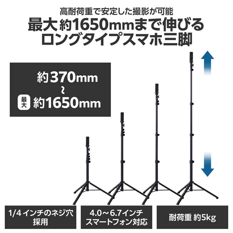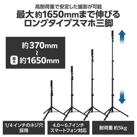 ●最大約1650mmまで伸びるロングタイプのスマホ三脚です。