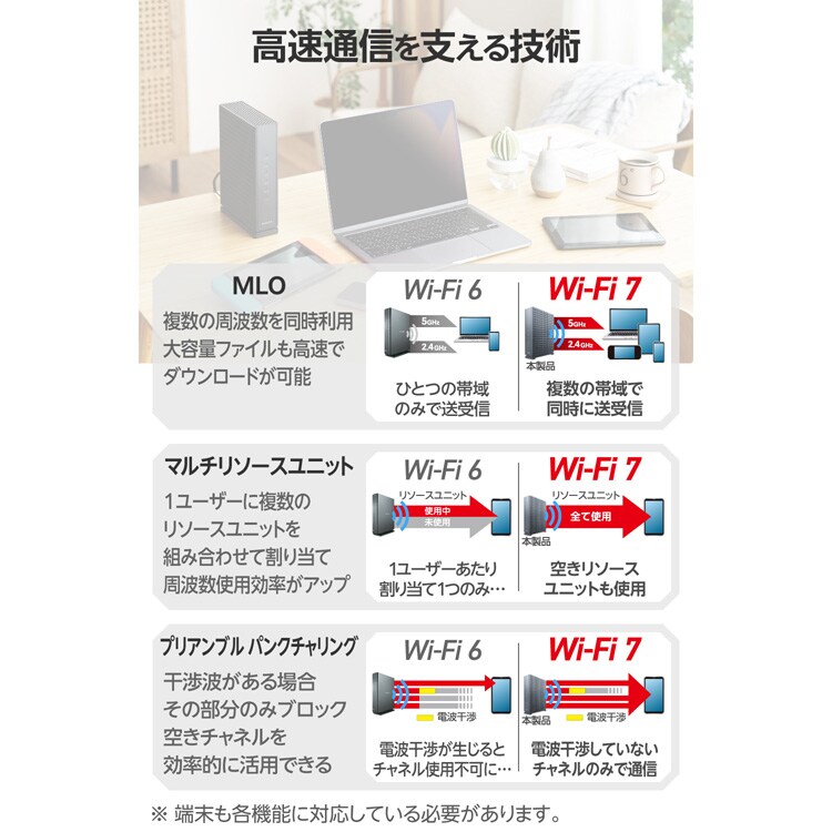 ●Wi-Fi 7対応でさらなる高速、低遅延で快適な通信を実現します。