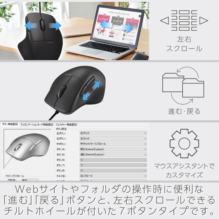 ●Webサイトやフォルダの操作時に便利な「進む」「戻る」ボタンと、左右スクロールができるチルトホイールが付いた合計7ボタンタイプです。
