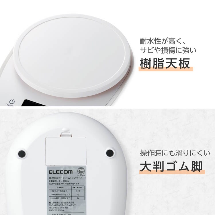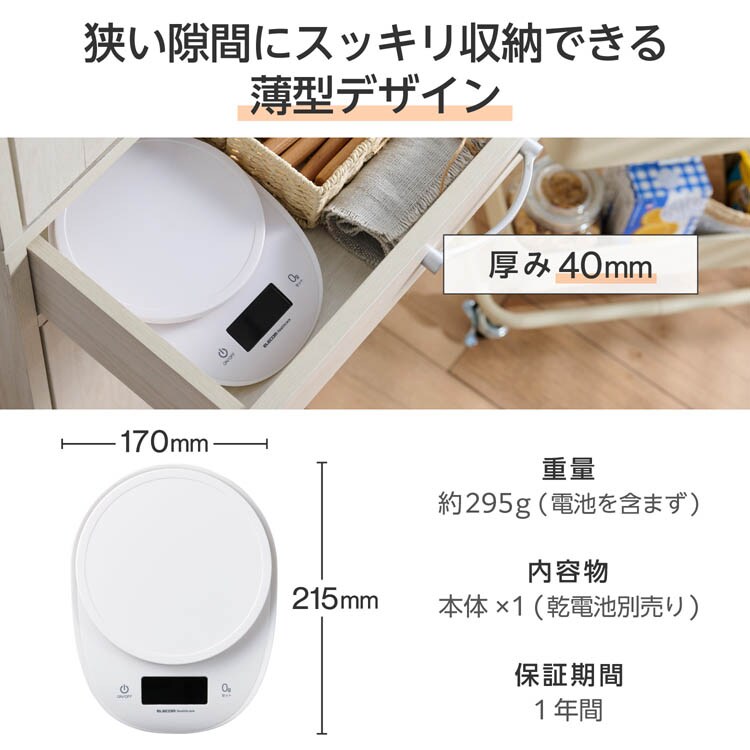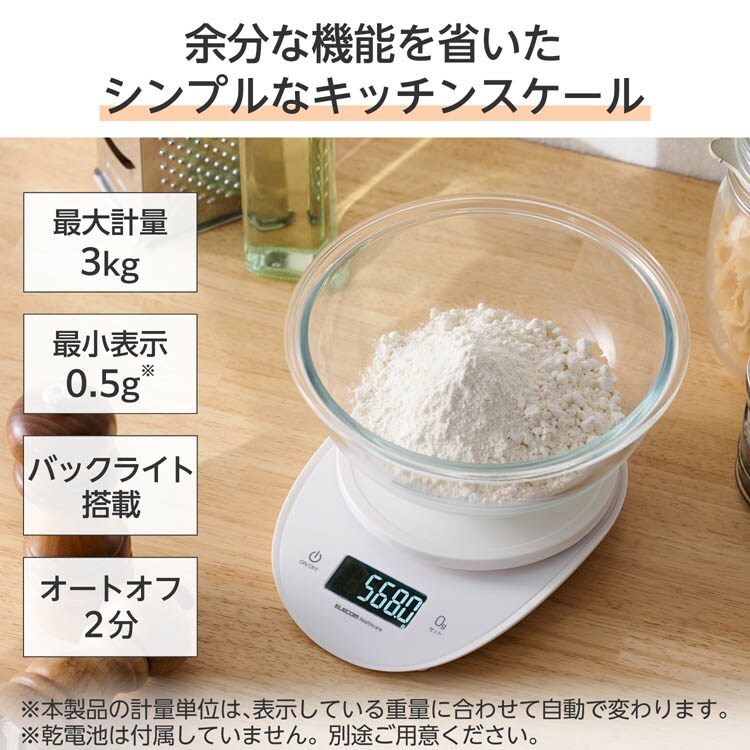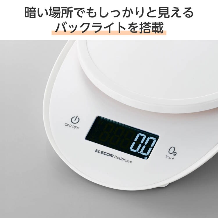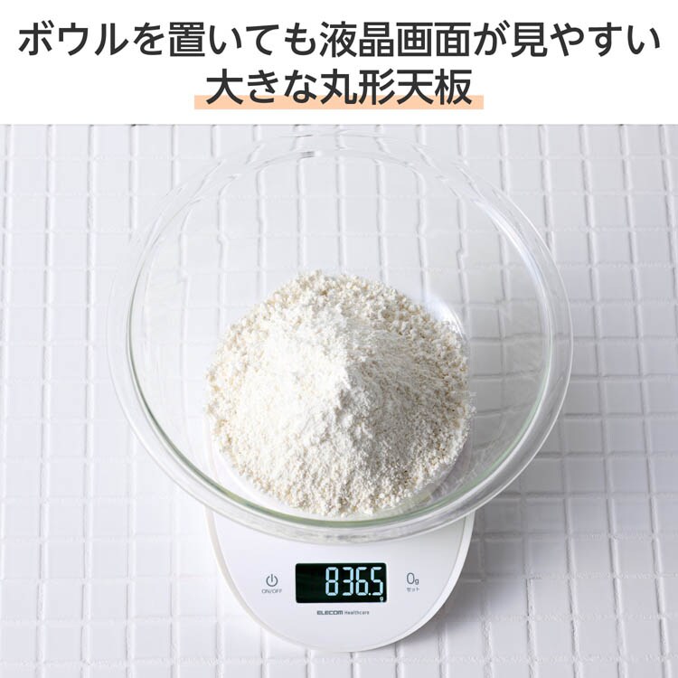 エレコムヘルスケア キッチンスケール デジタルスケール 大きな丸形天板 ホワイト (1個)