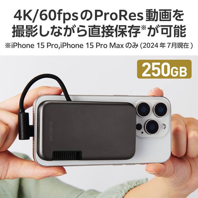 ●iPhone背面のマグネットに貼り付くため、SSD本体やコードがぶら下がった状態になりません。コードもゆとりがある設計で、接続しながら快適な操作が可能です。