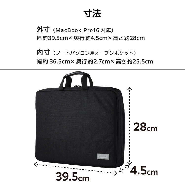 | ・外形寸法:W約395mm×D約45mm×H約280mm ※ハンドル含まず ・気室数:1 ・内寸:ノートパソコン用オープンポケット:W約365mm×D約27mm×H約255mm ※15.6インチノートパソコンの参考収納寸法 ・パソコン収納部内寸備考:※内寸と収納できるパソコンの外寸は異なる場合があります。詳しくはエレコムホームページの対応表でご確認ください。 ・ポケット(気室内):ノートパソコン用オープンポケット(飛び出し防止バンド付き)×1、オープンポケット(ストレッチメッシュ)×2 ・カラー:ブラック ・材質:ポリエステル ・質量:約265g ・対応モデル:~15.6インチノートパソコン ・表面加工:撥水加工(表生地) |