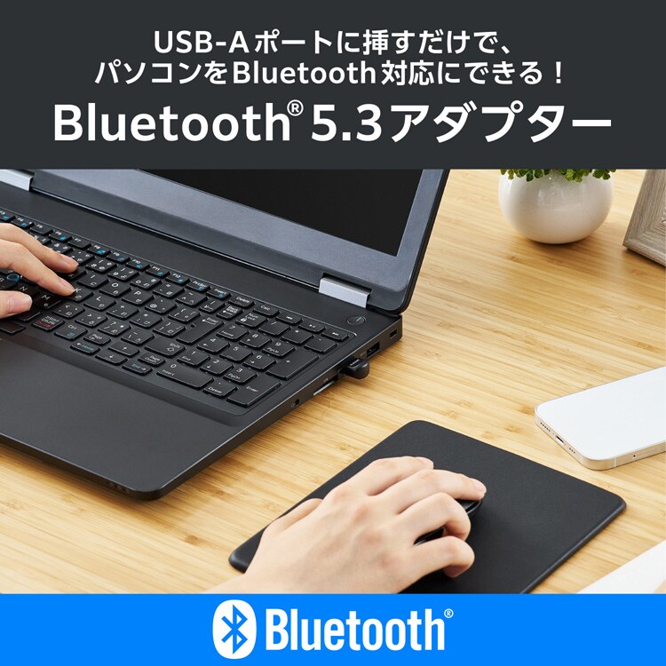 ●USB-Aポートに挿すだけで、パソコンをBluetooth(R)対応に。Bluetooth Ver.5.3 USBアダプターです。