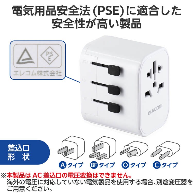 エレコム 変換アダプター 海外 A/BF/O/Cタイプ×1 USB-A×2 Type-C×1 ホワイト (1個)