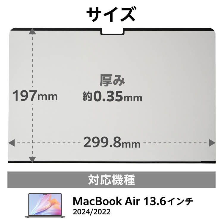 | ・対応機種:MacBook Air 13.6インチ(M4.2025/M3.2024/M2.2022モデル対応) ※2025年3月時点での情報です。 ・フィルター厚み:約0.35mm ・ブルーライトカット率:約20% ・紫外線カット率:約99.9% ・可視光線透過率:約60% ・表面硬度:2H ・静電気防止機能:× ・付属品:ケース×1 ・取り付け方法:パソコン内蔵のマグネット磁力で取り付け ・その他:環境に配慮した簡易パッケージ ・材質:PET、金属板 ・サイズ:幅299.8mm×高さ197mm |