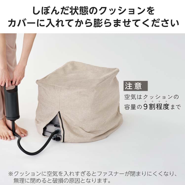 ※クッションに空気を入れすぎるとファスナーが閉まりにくくなり、無理に閉めると破損の原因となります。商品パッケージの「カバーの装着方法」「ご購入前に」をご確認の上、ご使用ください。