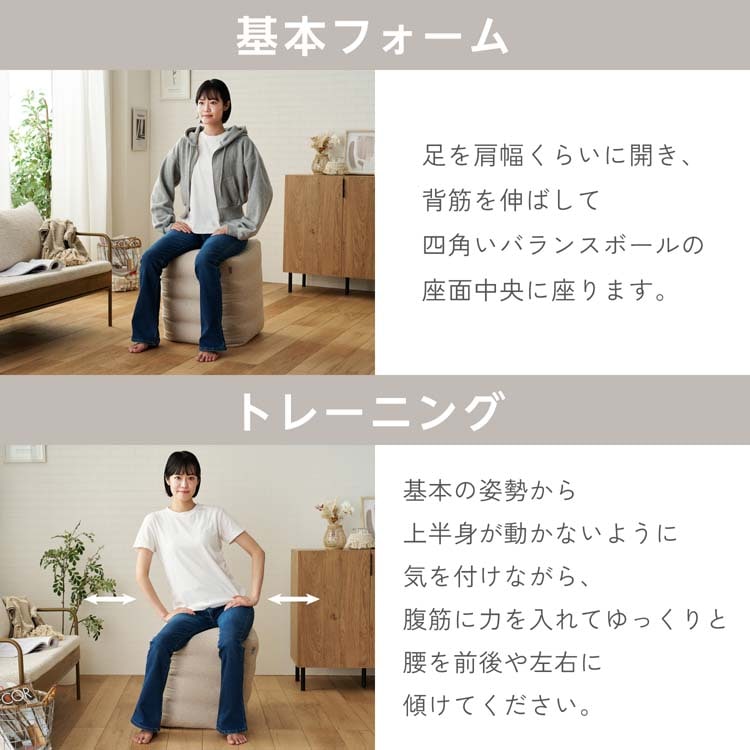 ●座るだけで簡単に体幹トレーニングができる、四角い形状のバランスボールです。