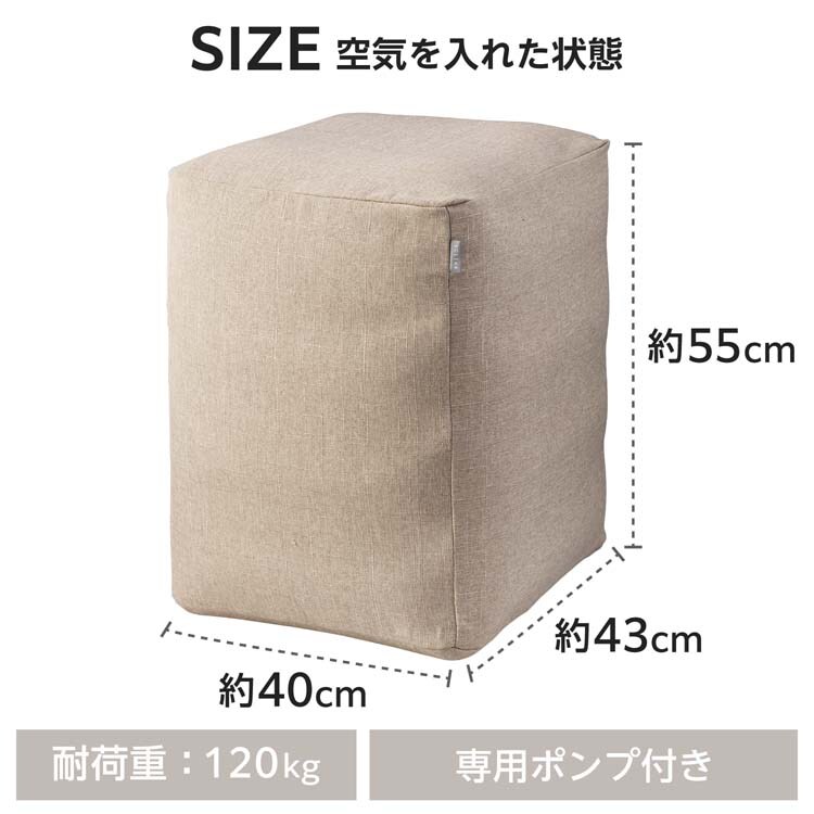 | ・カラー:ベージュ ・材質:クッション本体:PVC、クッション空気穴:PVC・ステンレス、専用カバー:ポリエステル、専用ポンプ:ポリプロピレン・ポリエチレン ・サイズ:W約40cm×D約43cm×H約55cm ※空気を入れた状態 ・耐荷重:120kg |