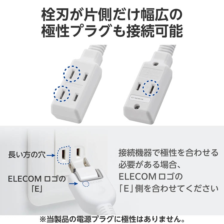 ●電源プラグには極性による栓刃幅の違いはありませんが、接続機器で極性を合わせる必要がある場合、コンセントの長い方の穴と電源プラグにあるELECOMロゴ(ELECOMとだけ書かれている面)の頭文字「E」側を合わせて挿し込んでください。