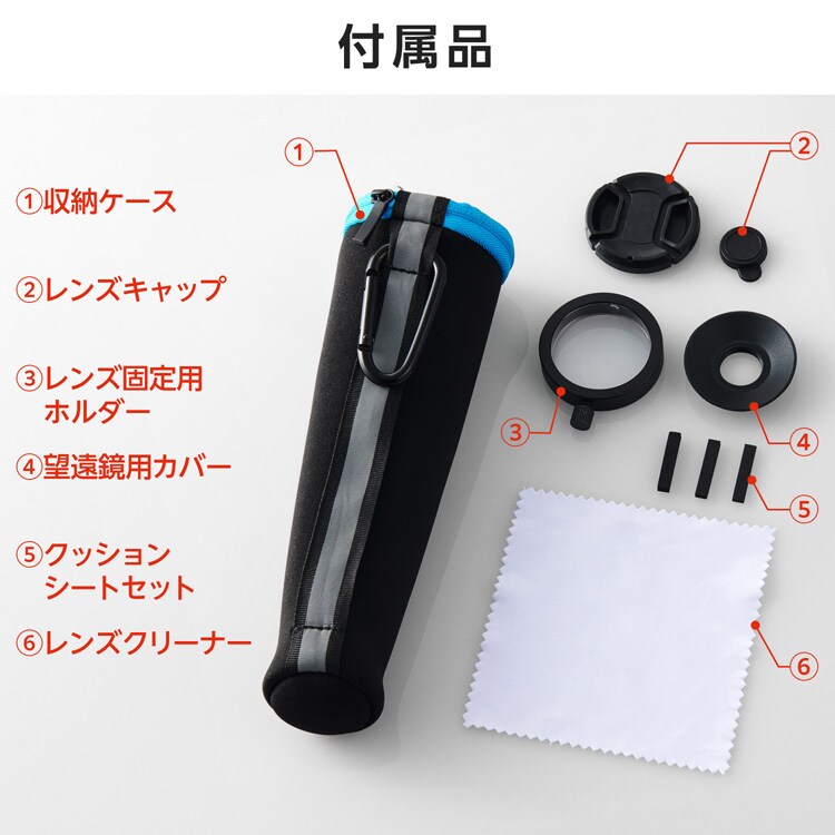 | 対応機種:各種スマートフォン レンズ種類:望遠16倍レンズ 材質:レンズ:アルミニウム、ガラス望遠鏡カバー:アルミニウム・シリコン、ホルダー:ABS・アルミニウム・シリコン、レンズキャップ:ABS、収納ポーチ:ナイロン・EVA サイズ:φ約52mm×H約85mm×D約219mm ※レンズ+ホルダー 重量:約300g ※レンズ+ホルダー クリップ挟み幅:約65mm~約100mm幅のスマートフォン対応 付属品:ホルダー、収納ポーチ、レンズキャップ、レンズ固定用ホルダー(機器本体用)、レンズ固定用ホルダー(アクセサリー取り付け用)、望遠鏡用カバー、レンズクリーナー |