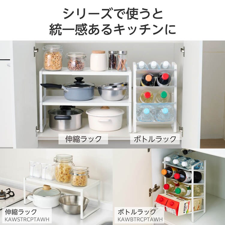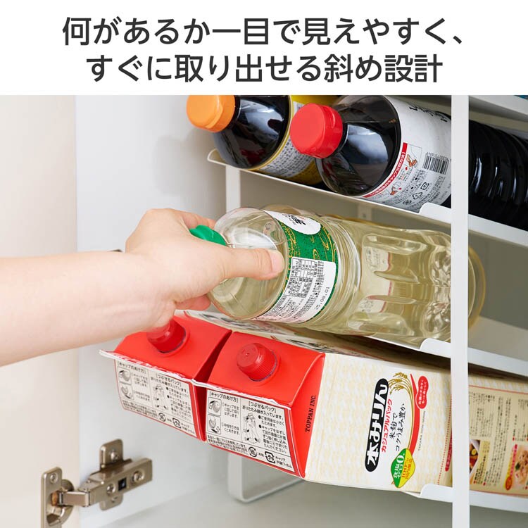 ●調味料ボトルや紙パック、ペットボトルなどをまとめて収納できる、ボトルラックです。