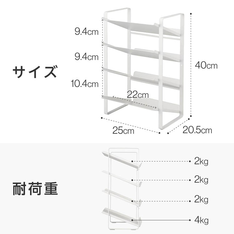 | ・サイズ:幅約250mm×奥行約205mm×高さ約400mm、棚内寸(上中段):幅約220mm×奥行約200mm×高さ約94mm・(最下段):幅約220mm×奥行約200mm×高さ約104mm ・サイズ:約2Lサイズボトル×約2本(最下段のみ)+約1Lサイズボトル約6本収納可能 ※ボトルの形状によっては収納できない場合があります。 ・重量:約1.7kg ・材質:スチール、シリコン ・耐荷重:上中段:約2kg、最下段:約4kg ・内容物:ボトルラック本体 ・カラー:ホワイト |