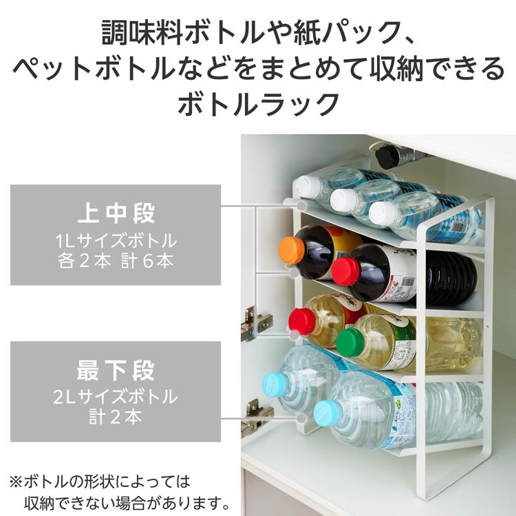 ●たっぷり入る4段のボトルラックで、上中段には約1Lサイズのボトルを約6本、最下段には約2Lサイズのボトルを約2本収納可能です。