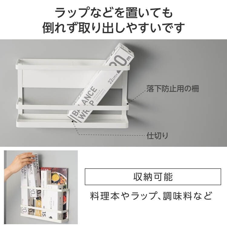 ●ラップホルダーには落下防止の柵と、底に仕切りがあるので、ラップなどを置いても倒れず取り出しやすいです。
