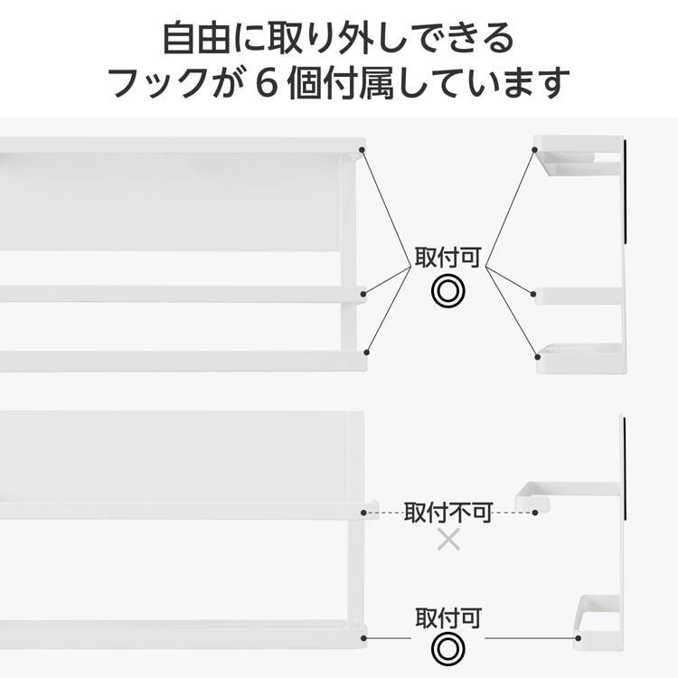 ●ラップホルダーの柵やキッチンペーパーホルダーの一番下のハンガー部分に取り付けられるフックが6個付属。フックは取り外しが可能なため、キッチン小物や布巾かけとしてもご使用いただけます。