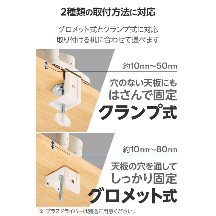 ●デスクの天板に挟んで固定するクランプ式と、天板に穴を開けてボルトを通して固定するグロメット式の2通りの取り付け方法が選べます。