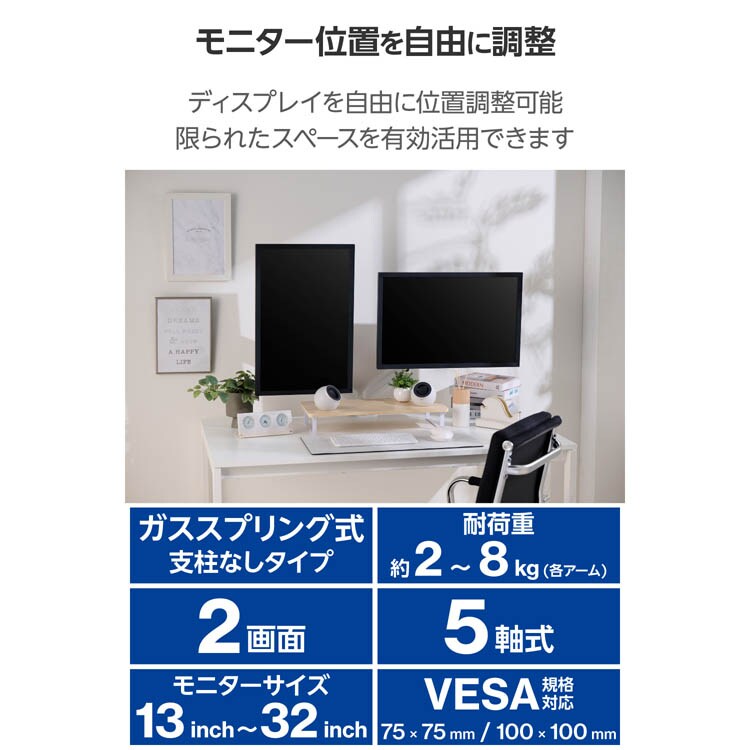 ●13~32インチサイズのモニターに対応するガススプリング式のデュアルモニターアームです。