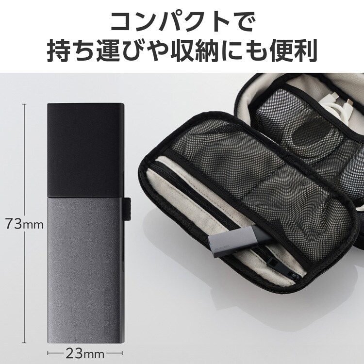 ●USB-AとUSB Type-Cが一体でありながら、重さ約18g、幅73.0mm×奥行23.0mm×高さ9.0mmというコンパクトさで、持ち運びや収納にも便利なUSBメモリサイズです。