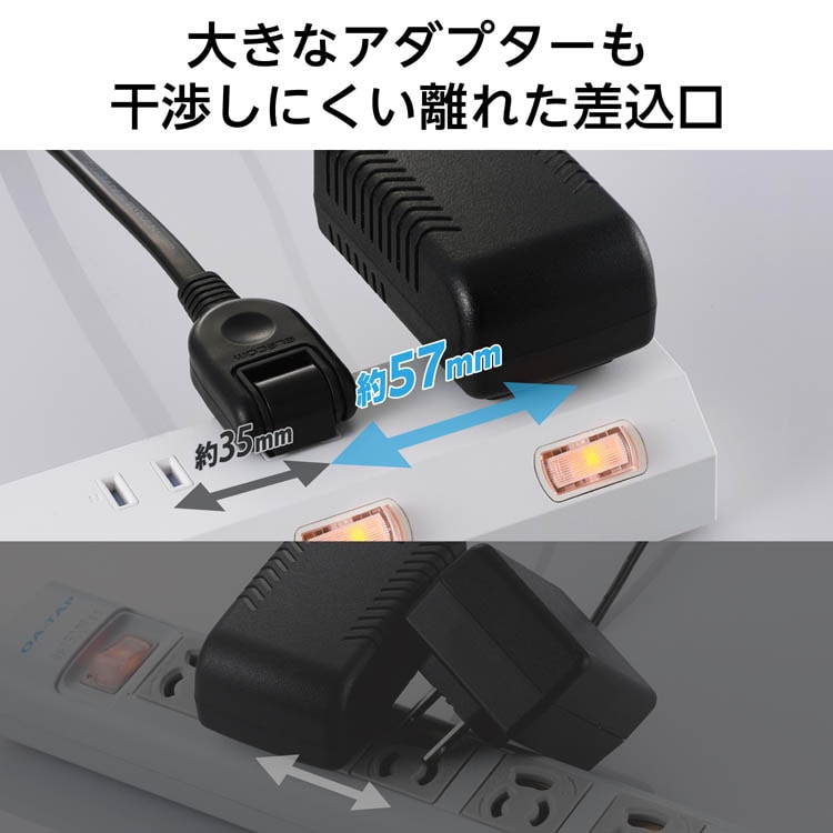 ●差込口の間隔は広いところが57mm、狭いところが35mmです。広い間隔で配置された差込口は、大きなアダプターを挿しても隣の差込口に干渉しにくくなっています。