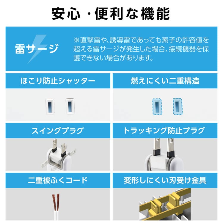 | ・差込口仕様:2ピン(極性のある2ピン式プラグも接続可能) ・差込口個数:3個口 ・差込口間隔:57mm、35mm ・プラグ仕様:2ピン ・ACコード長:2m ・定格:125V、15A、1500Wまで ・極性対応:差込口は対応、プラグは目印のみ ・スイッチ:対応(個別スイッチ) ・雷ガード:対応 ・ホコリシャッター:対応 ・抜け止め機能:× ・差込口キャップ:× ・通電表示ランプ:対応(個別スイッチ) ・二重構造:対応 ・二重被ふく:対応 ・絶縁キャップ付きプラグ:対応 ・スイングプラグ:対応 ・マグネット:× ・吊り穴:× ・ブレーカー:× ・ノイズフィルター:× ・モジュラージャック:× ・連動機能:× ・変換アダプター:× ・カラー:ホワイト ・材質:ABS樹脂、PVC樹脂、ユリア樹脂、黄銅、銅 ・外形寸法:幅約168mm×奥行約50mm×高さ約32mm ※コード部分およびプラグ部分を除く ・質量:約305g ・付属品:取扱説明書 ・使用可能地域:日本国内専用 ・法規:PSE(特定電気用品) ・保証期間:1年間 |