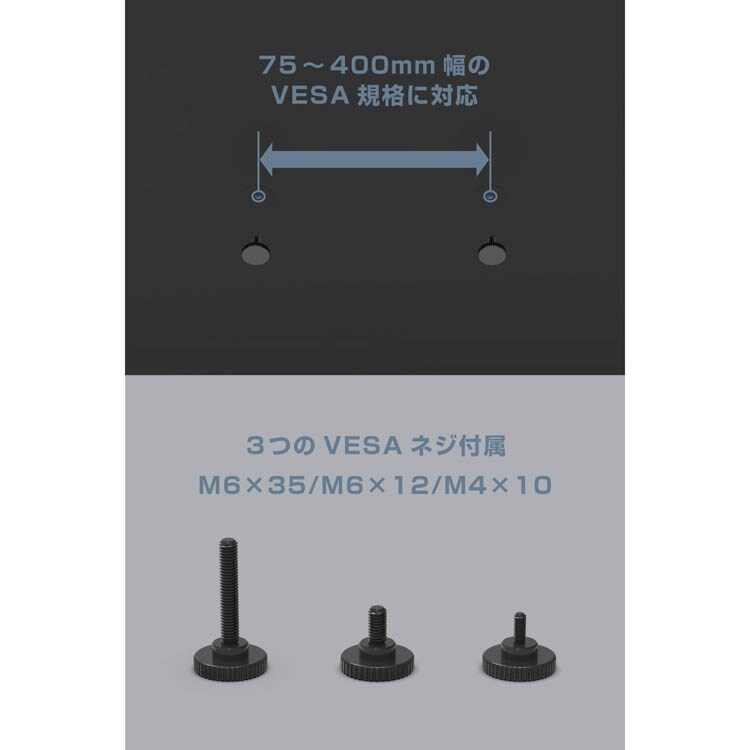 | VESAネジ3種(M4×10、M6×12、M6×35)各2本 VESAネジ用アタッチメント×2個 結束バンド(取り外し可能)×3本 結束バンド用アタッチメント×3個 取扱説明書 |